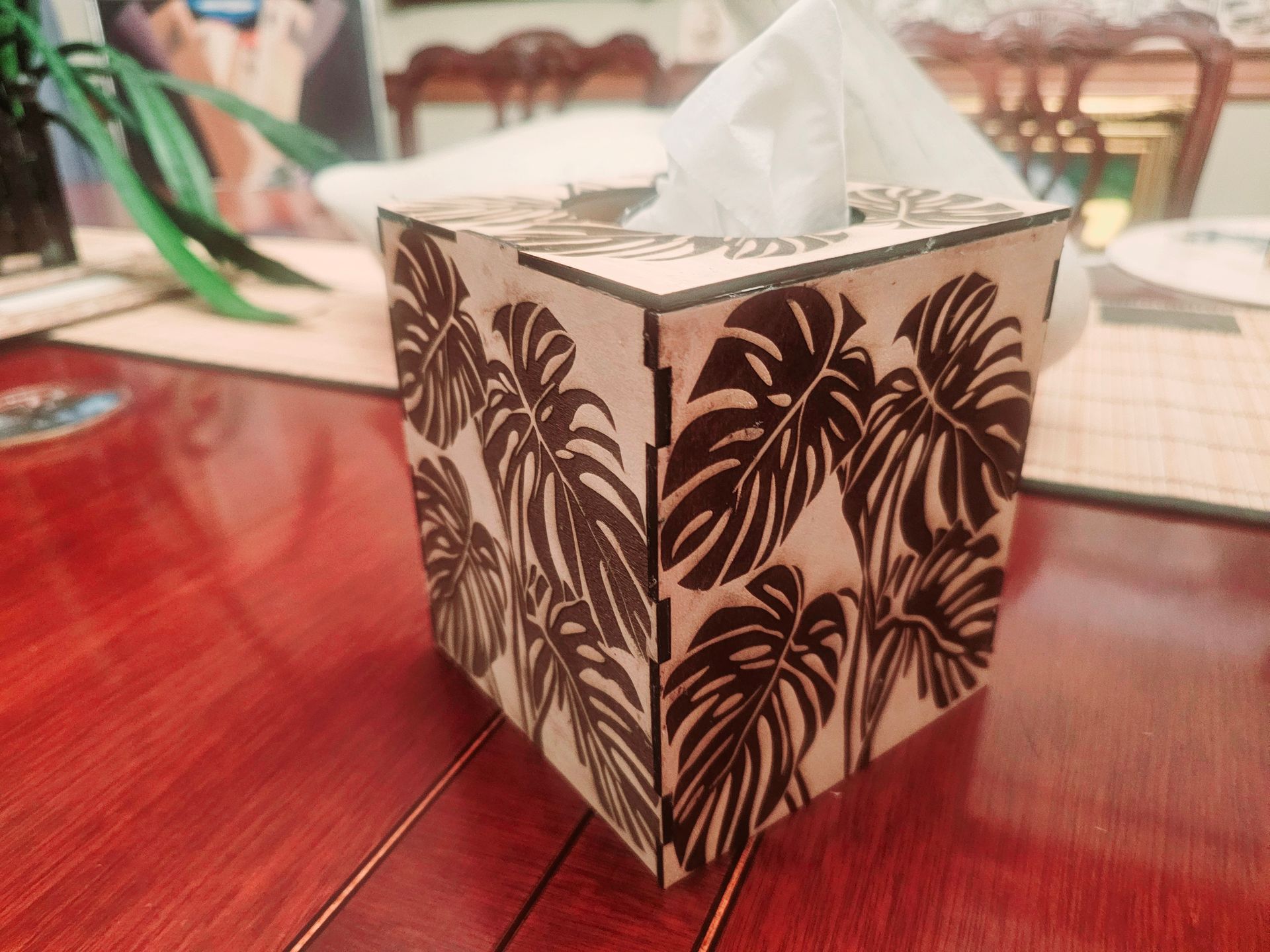 Transforming paper boxes with customized themes. Ability to support three tissue box sizes.