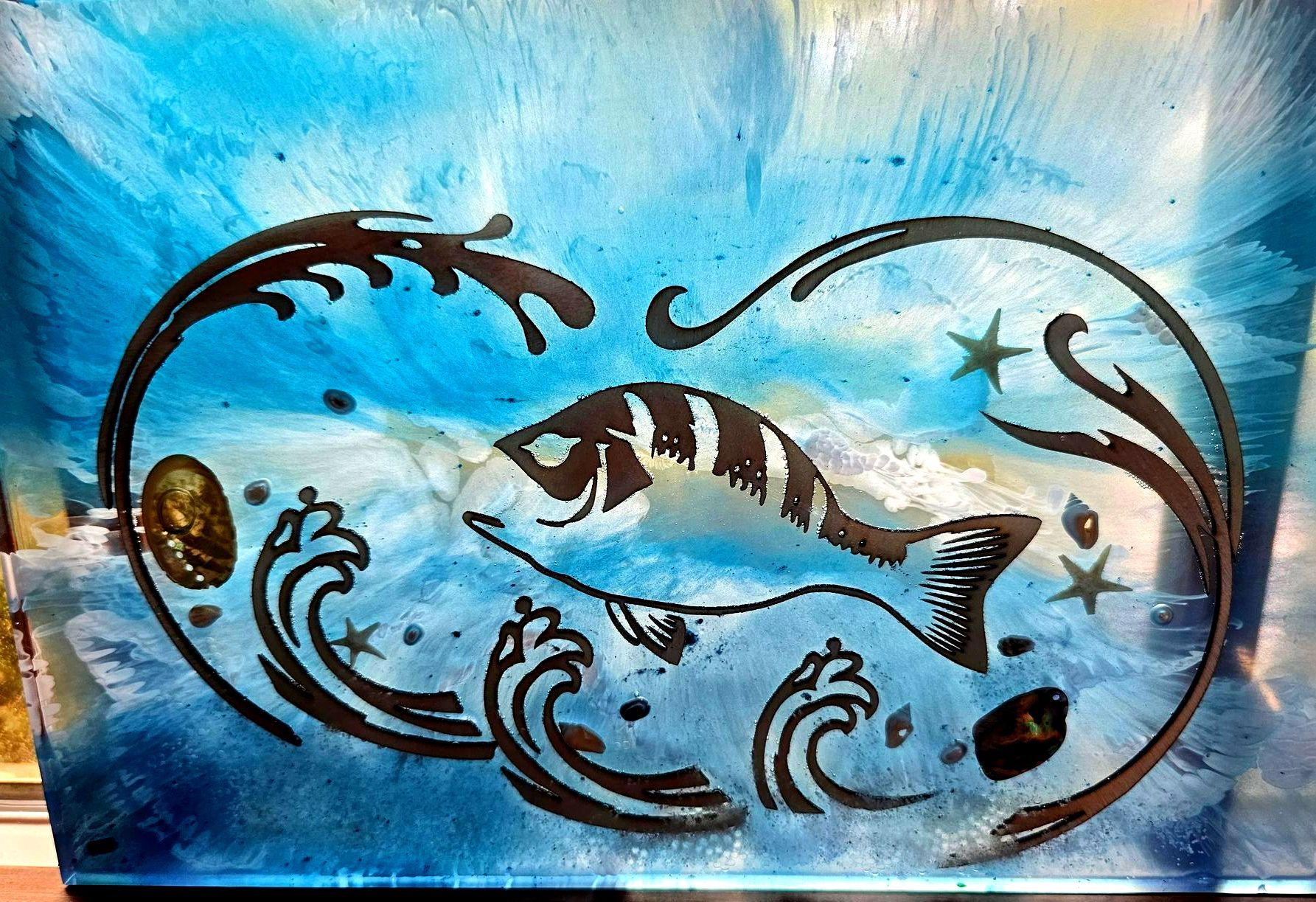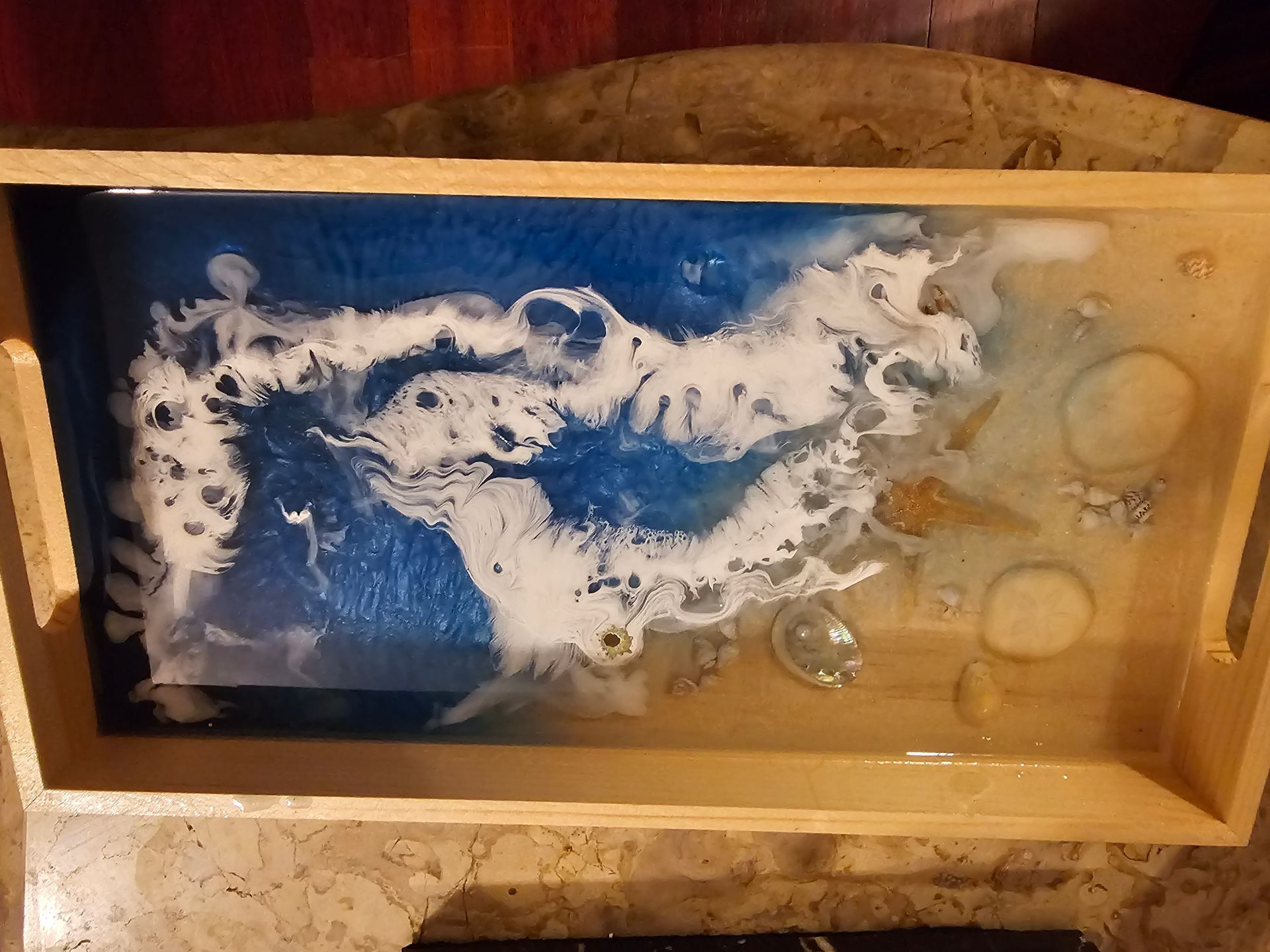 Leveraging pieces left over from other projects and adding pearls, shells and star fishes, made a wave scene that I embedded into resin.