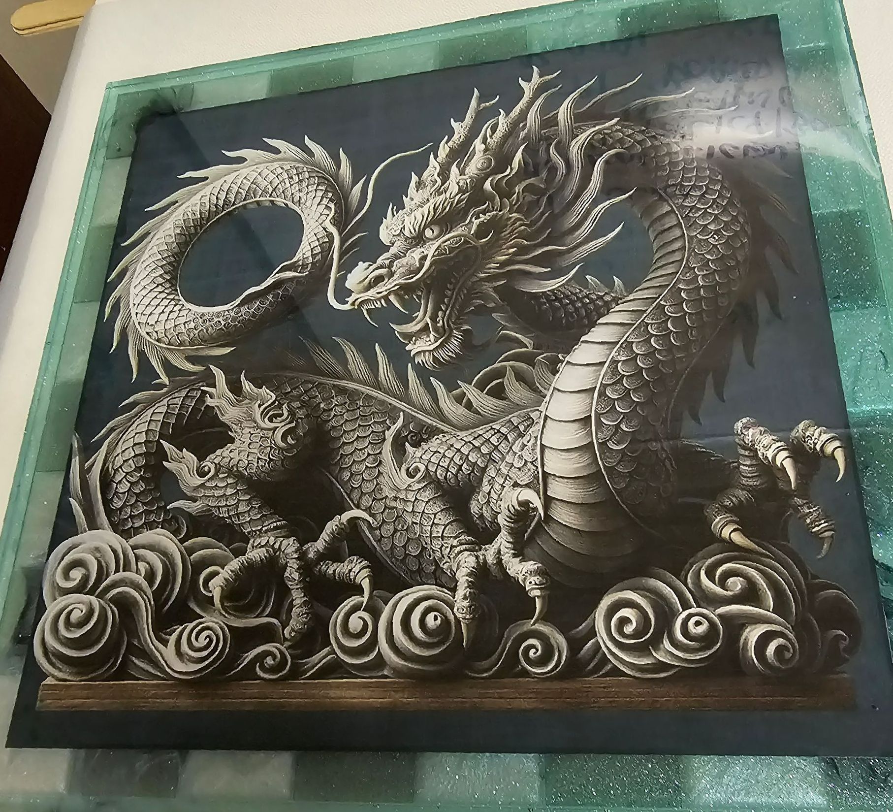 Creating a dragon image, printing it and embedding it into a resin chess board allosed some fun experimenting.