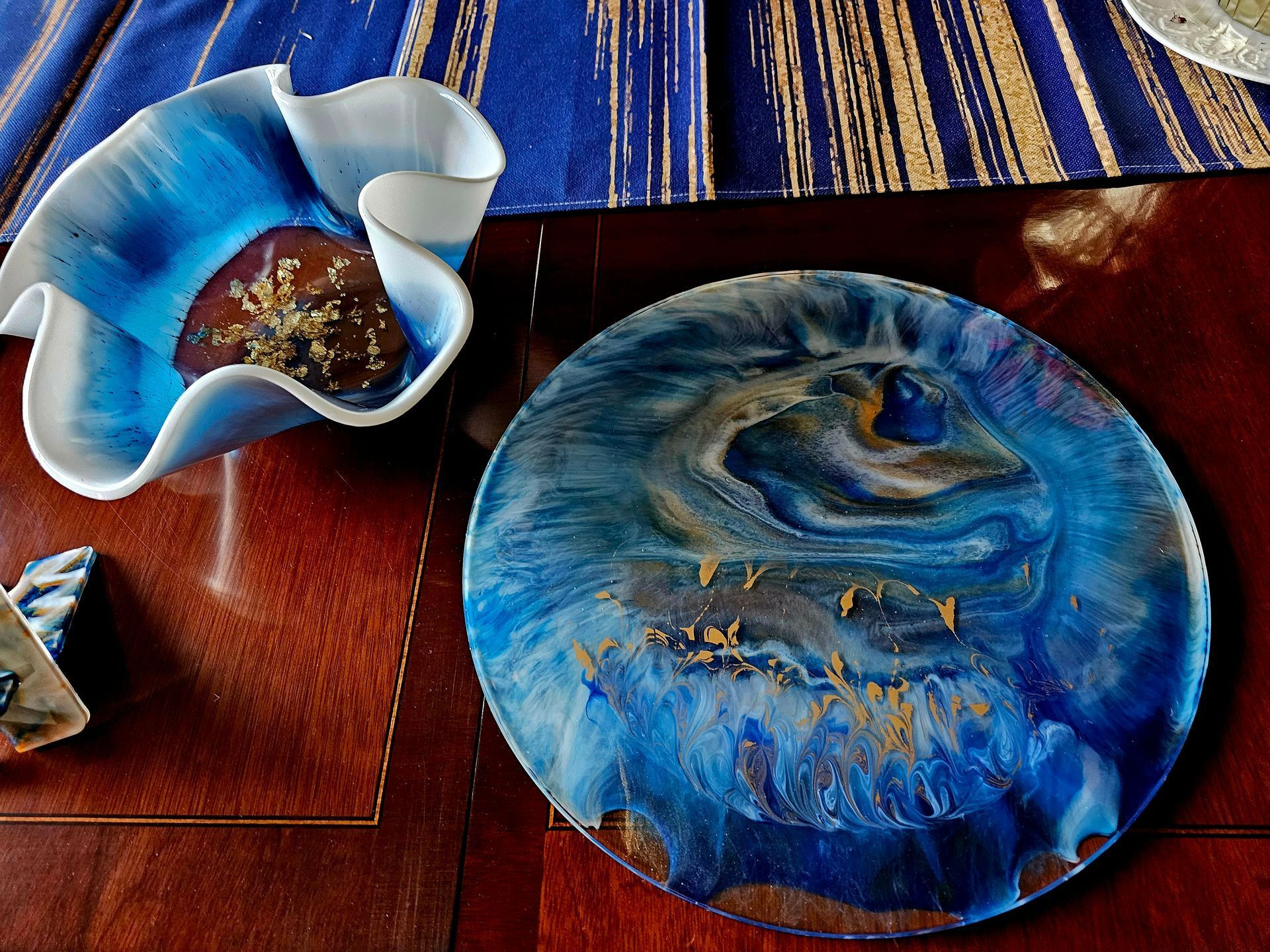 Enjoyed creating different items leverage blue, white and gold to create a bowl and a charger for a plate. With resin, each piece is unique.