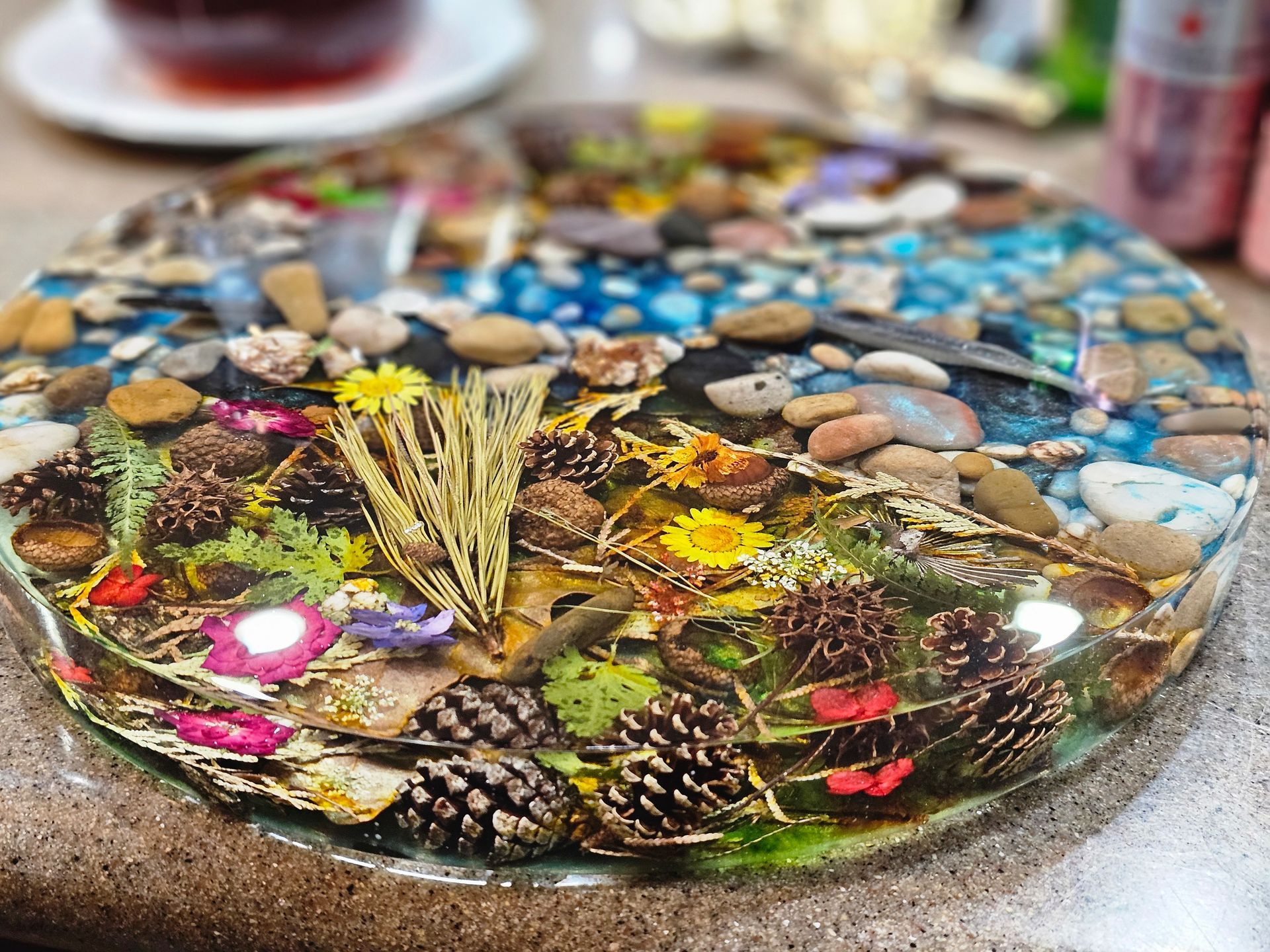 Leveraging pieces from woodwork, combined pieces and leveraged resin to provide color and bring it together.
